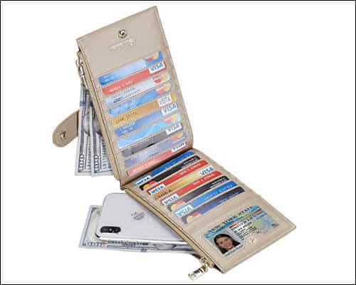 Travelambo utilizza pelle sintetica di alta qualità per renderlo un portafoglio economico ma straordinario per le donne. Questa custodia morbida e resistente è dotata di due lunghi scomparti con cerniera per contanti e cellulare. Puoi scegliere qualsiasi titolare della carta da una gamma impressionante di quarantacinque tonalità.