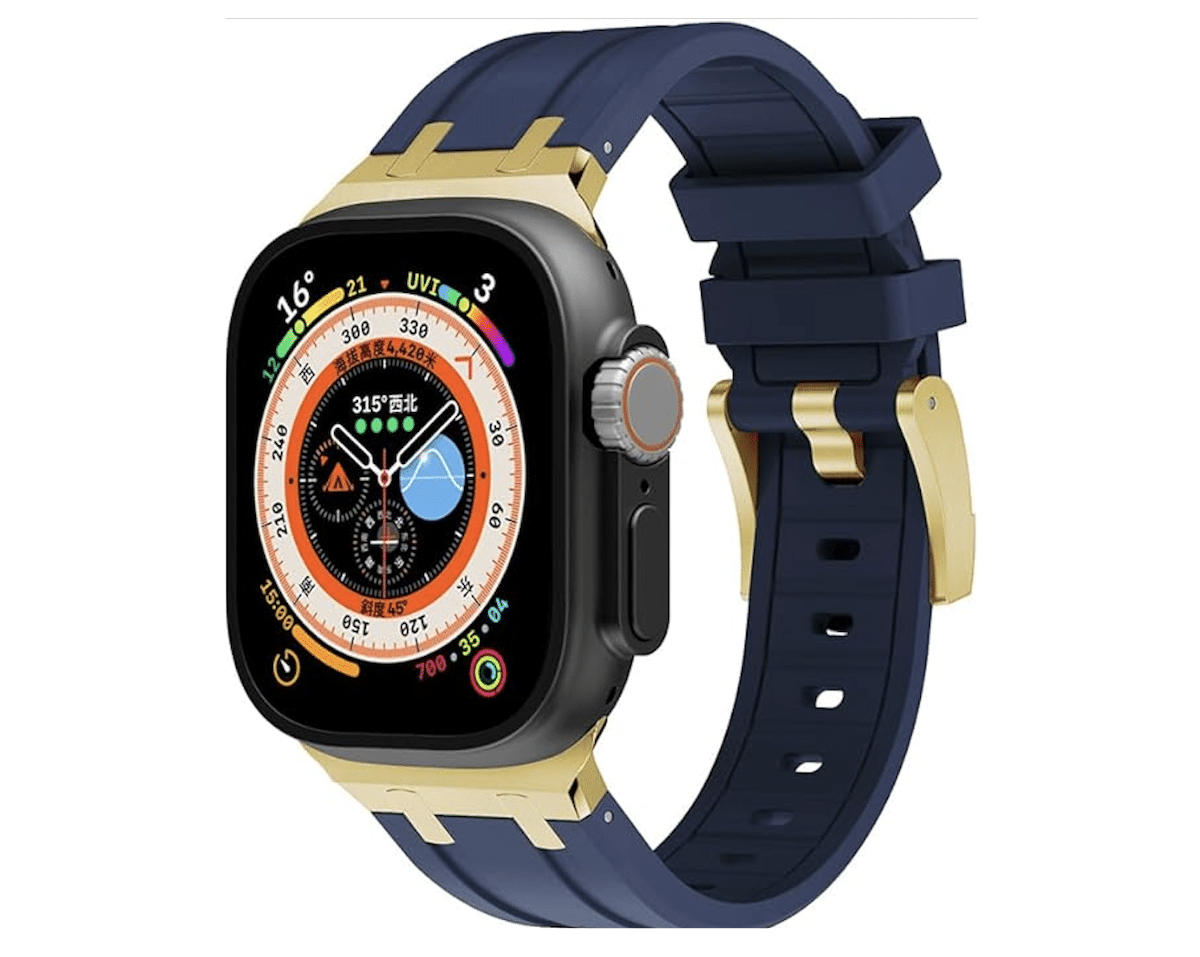 MRYUESG offre un cinturino per orologioper Apple Watch Ultra 2 con connettori e fibbie dorate e argentate realizzate in silicone e acciaio inossidabile di alta qualità per resistenza e vestibilità comoda.
