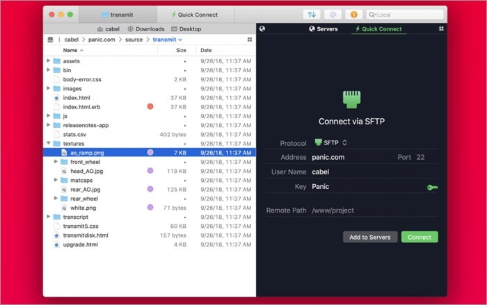 Transmit 5 ha la migliore interfaccia utente tra tutti i client FTP su Mac. Con un solo clic, puoi connetterti rapidamente a più servizi di archiviazione cloud come Box, Google Drive, Amazon Drive, ecc. e iniziare a caricare file sul server.