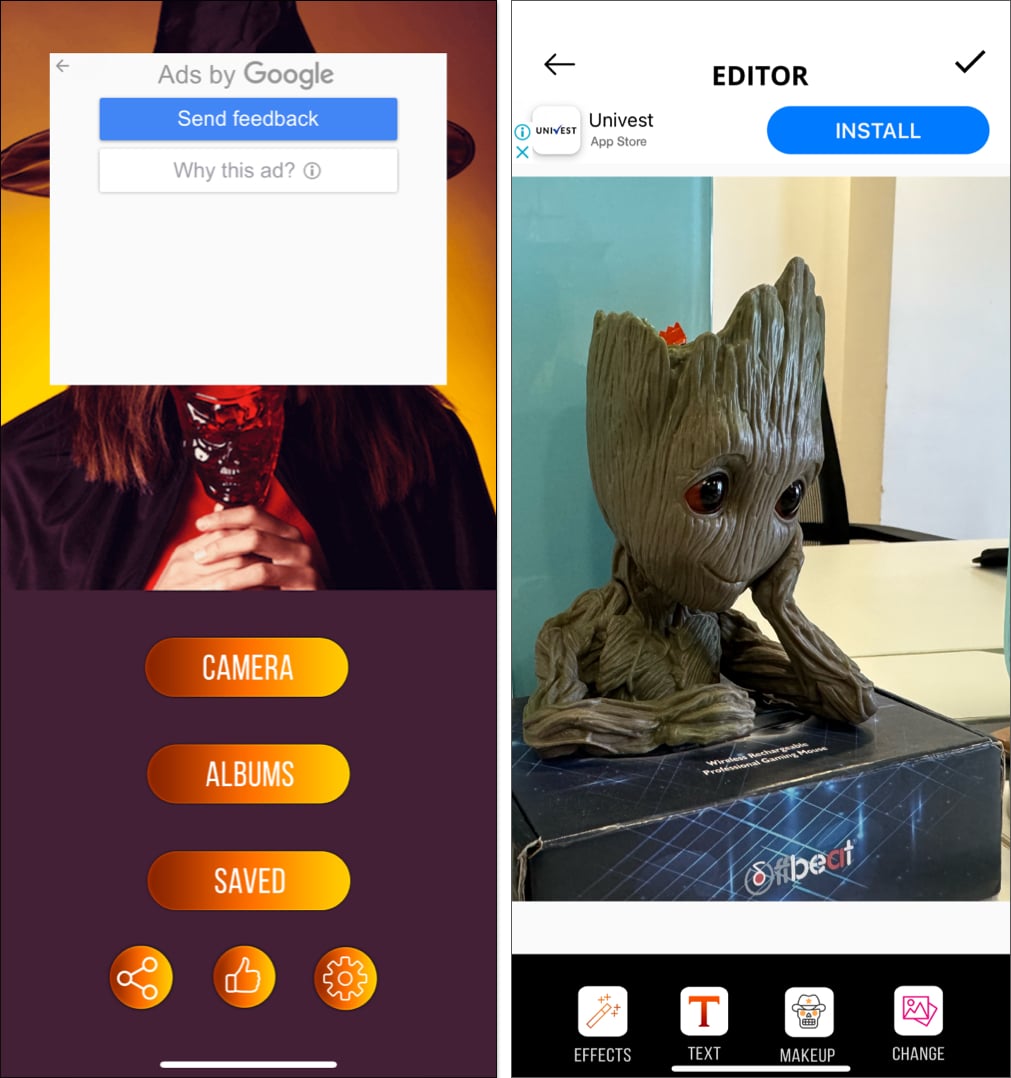 Vuoi pubblicare alcune foto spaventose sul tuo Instagram durante la settimana di Halloween? Penso che Halloween Makeup Editor sarebbe una buona aggiunta al tuo arsenale di app. L'app è fondamentalmente un'app di modifica che elabora le tue foto con adesivi di tua scelta per aggiungere un'atmosfera inquietante e inquietante.
