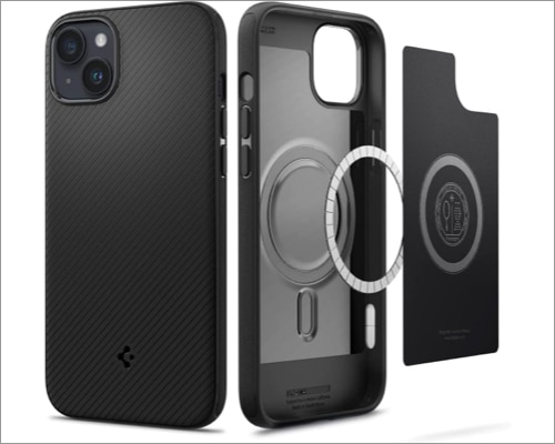 La parte migliore è che è sottile 0,07″ e i bordi rialzati proteggono lo schermo e le fotocamere dai graffi. Inoltre, la tecnologia Air Cushion di Spigen con angoli imbottiti fornisce un'ulteriore protezione dalle cadute. E senza dubbio, i suoi magneti integrati sono potenti e completano la ricarica wireless e gli accessori MagSafe.