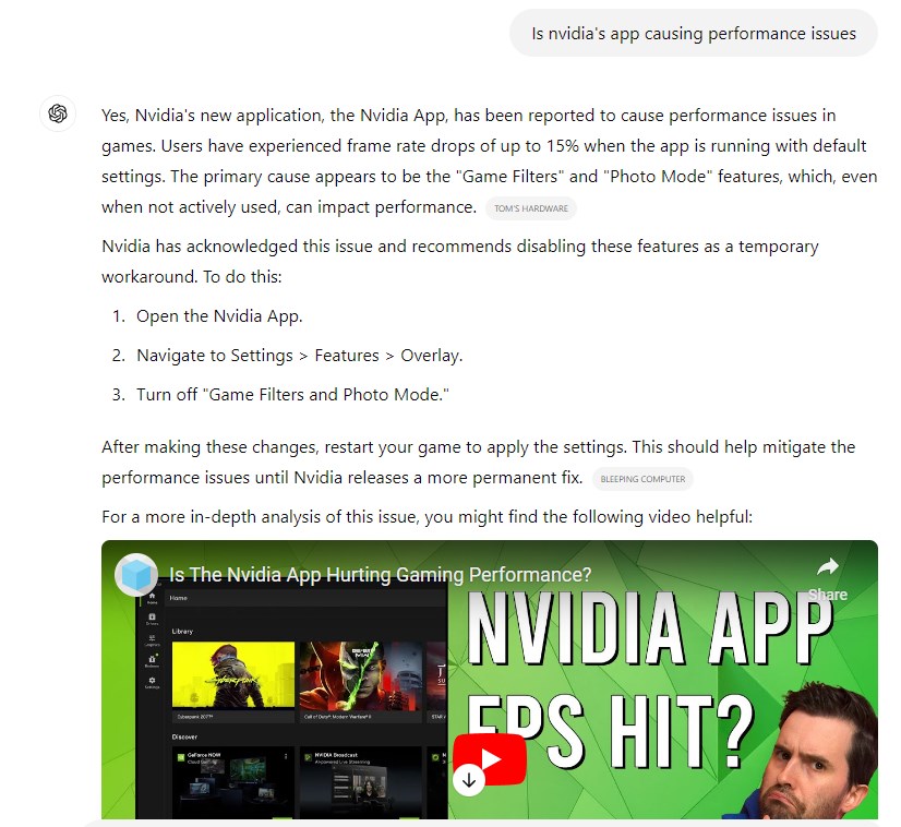 I risultati di ricerca di ChatGPT includono le fonti e il bot mostra anche un video in linea pertinente all'argomento. Puoi fornire feedback per migliorare i risultati.
