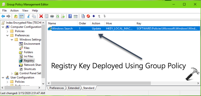 Questo articolo ti mostrerà l'approccio passo passo per distribuire una chiave o un elemento del Registro di sistema utilizzando Criteri di gruppo. Per illustrare questo processo, creeremoAllowIndexingEncryptedStoresOrItemsDWORD del registro inHKEY_LOCAL_MACHINE\Software\Policies\Microsoft\Windows\Windows Searche impostarlo su 1. Viene creato il DWORD del registroconsentire a Windows 10 di indicizzare i file crittografati.