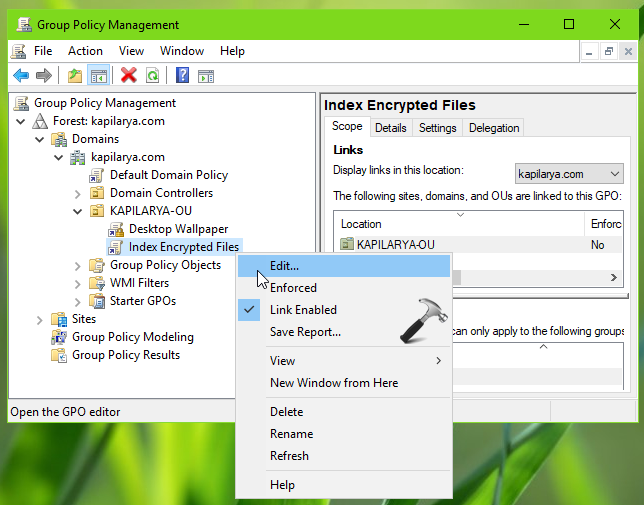 2.Nella finestra Gestione criteri di gruppo, fai clic con il pulsante destro del mouse sul tuo dominio/unità organizzativa preferita e selezionaCrea un oggetto Criteri di gruppo in questo dominio e collegalo qui. Se hai già creato un oggetto Criteri di gruppo, puoi invece utilizzare Collega un oggetto Criteri di gruppo esistente. Quindi fare clic con il pulsante destro del mouse sull'oggetto GPO creato finora e selezionareModificare.