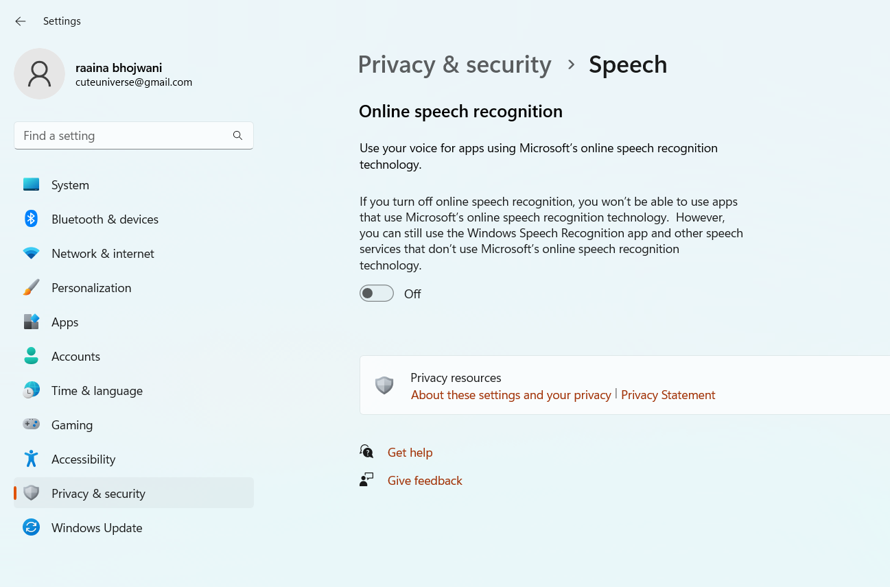 3. Ora puoi attivare/disattivare l'opzione Riconoscimento vocale di Windows.