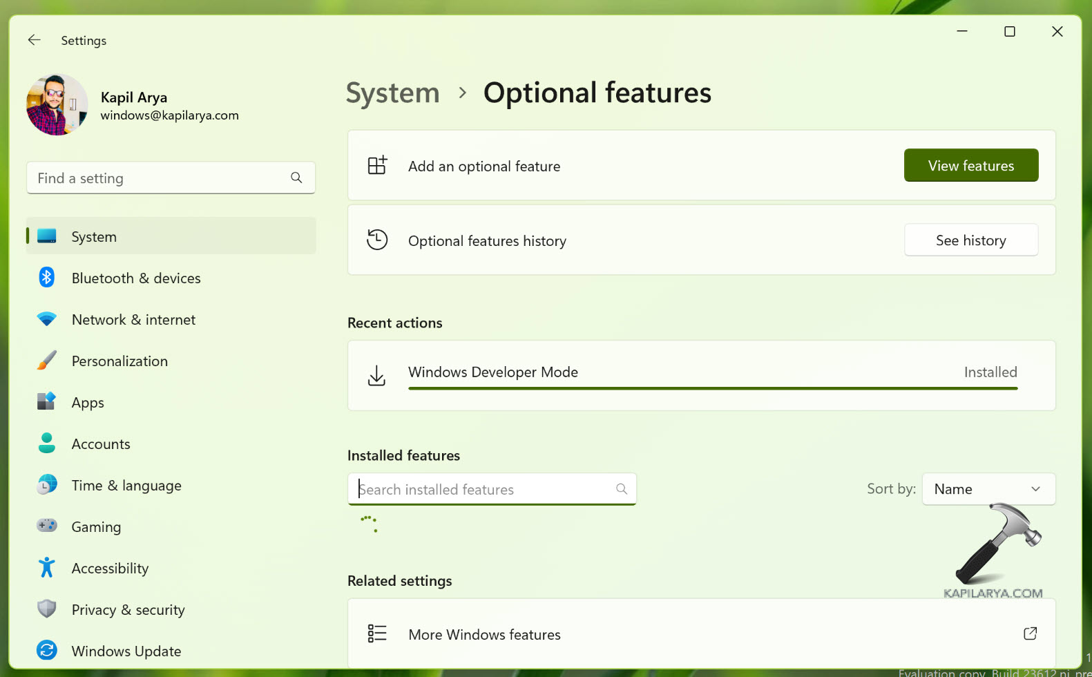 3. Tra pochi istanti vedrai la notifica "Stiamo aggiungendo una nuova funzionalità a Windows, l'operazione potrebbe richiedere alcuni minuti". Se fai clic su tale notifica, verrai indirizzato alla pagina Funzionalità opzionali, dove troverai il pacchetto Modalità sviluppatore Windows in fase di installazione.