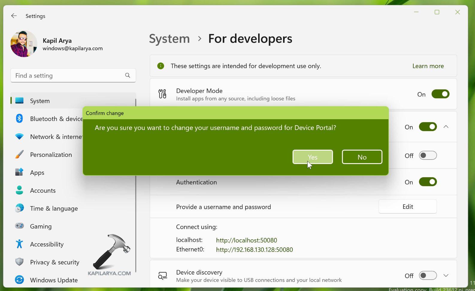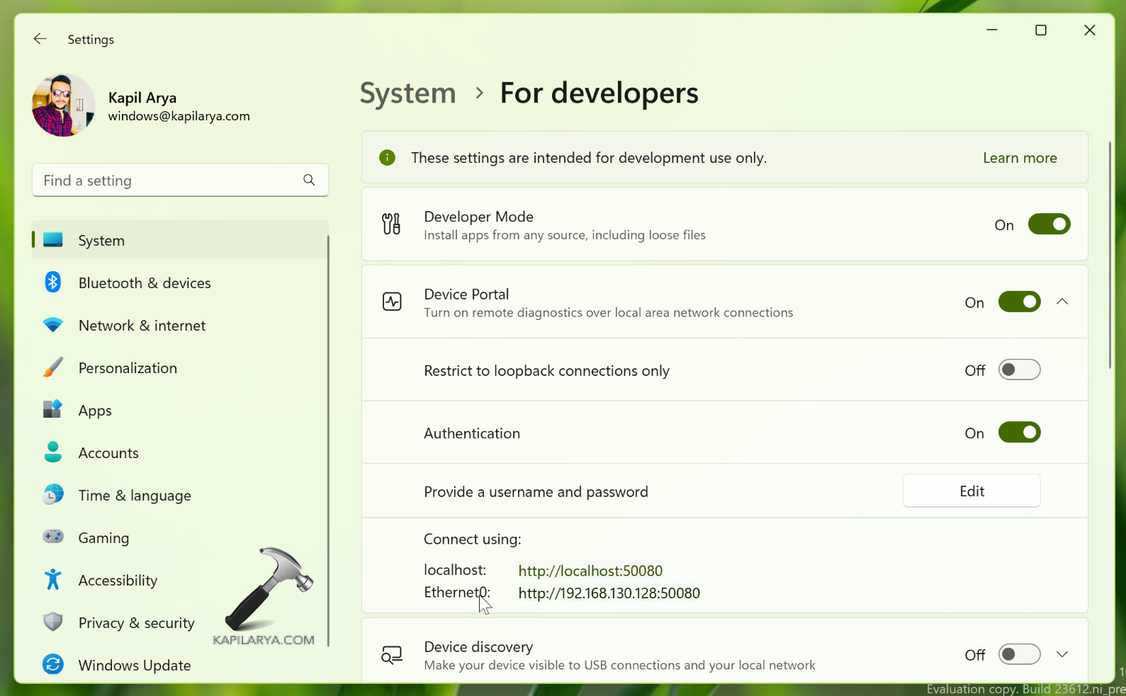 4. Una volta installato il pacchetto Modalità sviluppatore Windows, l'opzione Portale dispositivi dovrebbe essere attivata. Ora puoi accedervi utilizzando i collegamenti menzionati rispetto a localhost e connessione Ethernet.