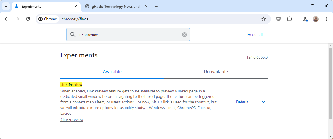 - Carica chrome://flags/#link-preview nella barra degli indirizzi del browser.