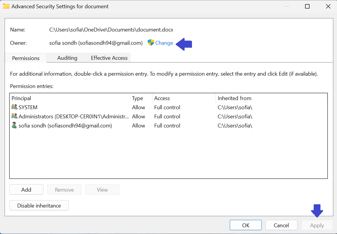 8. Noterai che il nome del Titolare è cambiato nel tuo nome e clicca su Applica, nel messaggio di avviso clicca su Sì per continuare con questa operazione. Fare clic su OK due volte per completare il processo di modifica delle autorizzazioni.