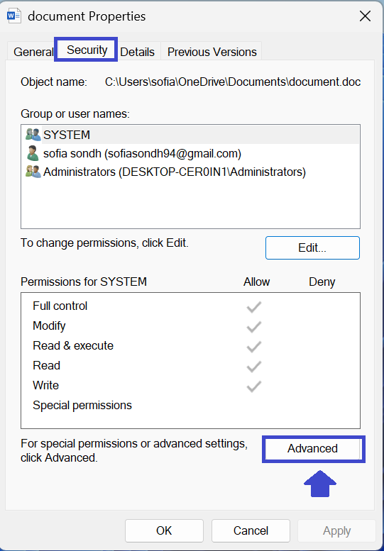 2. Vai alla scheda Sicurezza nella finestra Proprietà. (vedi l'immagine qui sotto)