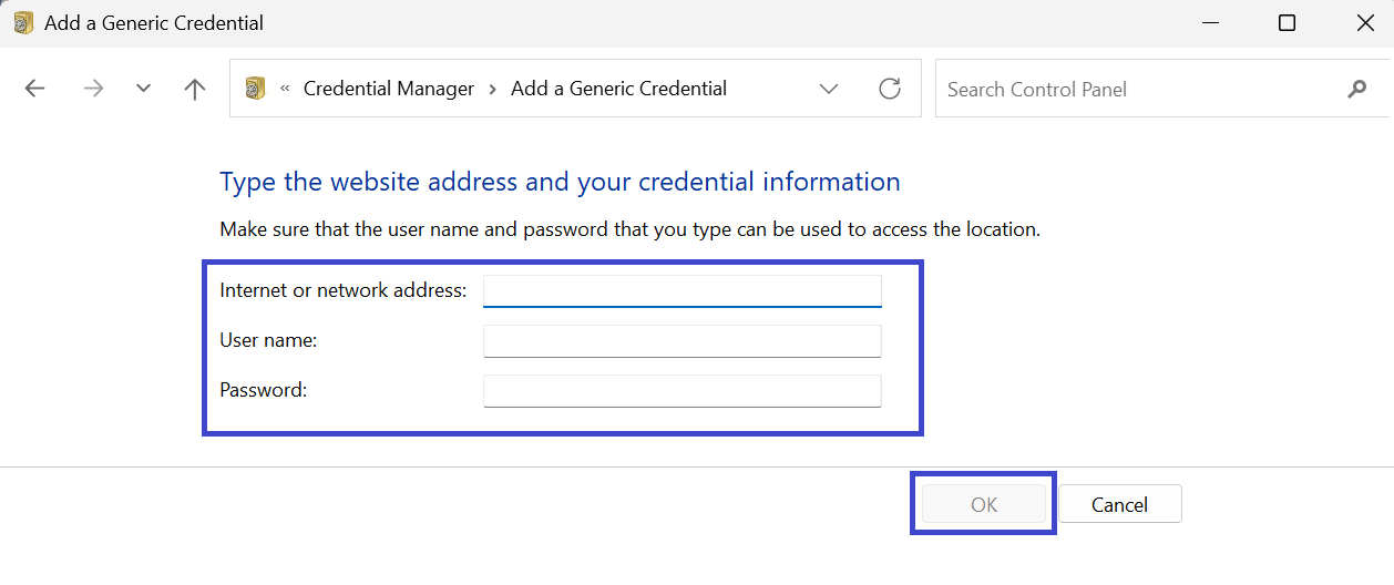 Correzione 1: immettere manualmente le credenziali in Gestione credenziali