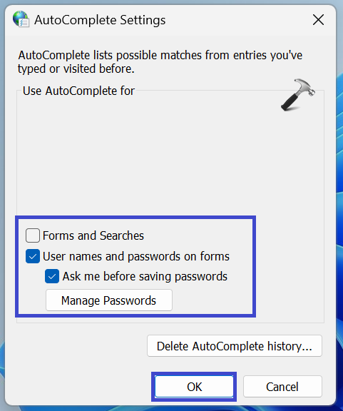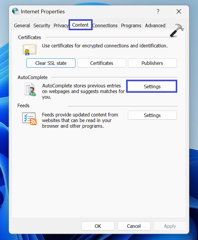2. Verrà visualizzata la finestra Proprietà Internet. Vai al “Contenutoscheda " e fare clic su "Impostazioni" sotto ilCompletamento automaticosezione.