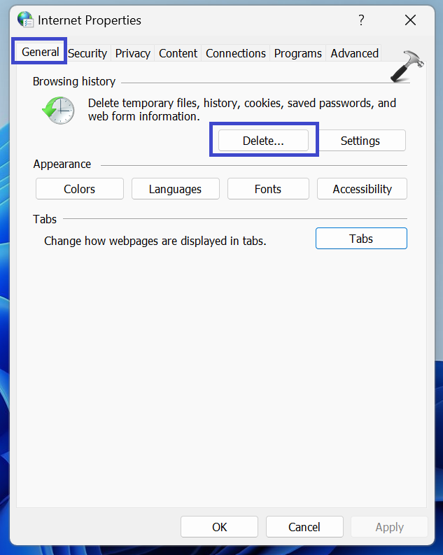 4. Ora vai su "Generale" scheda. Sotto ilCronologia di navigazionesezione, fare clic su "Eliminare…pulsante ".