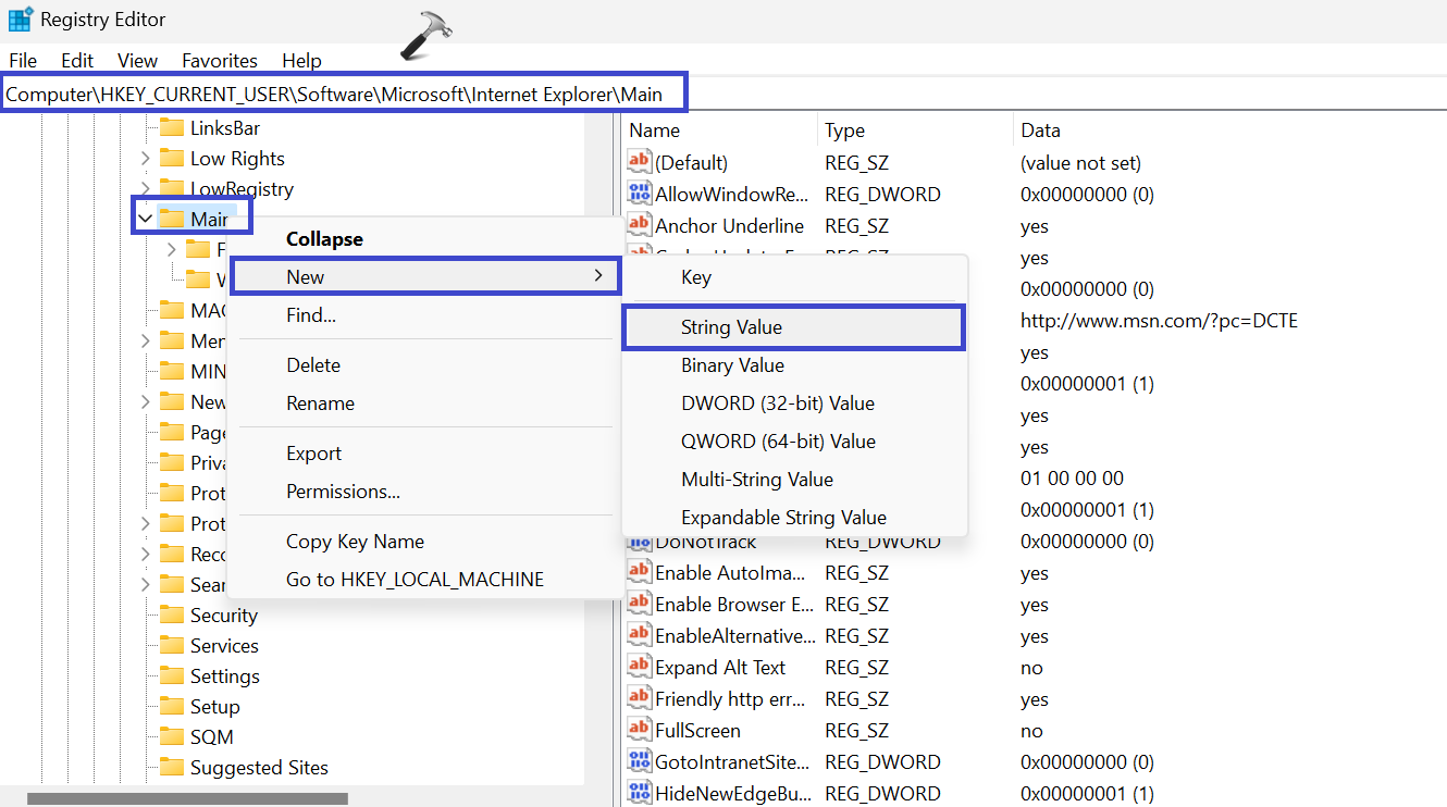 HKEY_CURRENT_USERSoftwareMicrosoftInternet ExplorerMain