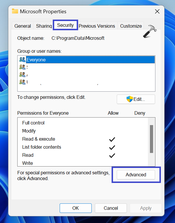 4. Apparirà una finestra di dialogo. Nella scheda Sicurezza, fai clic su "Avanzato" opzione.