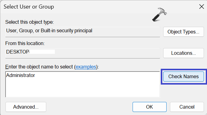 4. Inserisci Amministratori sotto "Immettere il nome dell'oggetto da selezionare" sezione.