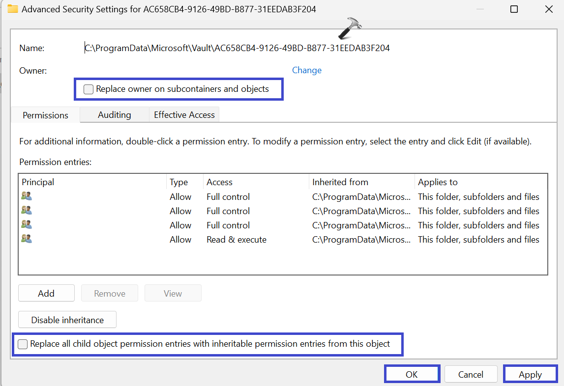6. Infine, seleziona "Sostituisci tutte le voci relative alle autorizzazioni degli oggetti secondari". Fare clic su OK seguito da Applica.