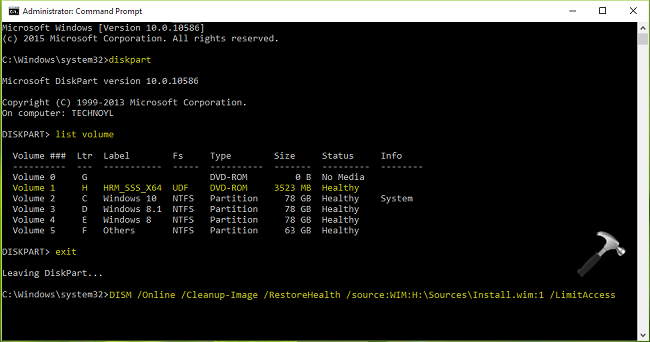 Ora hai reindirizzato DISM al file ISO di Windows montato. Pertanto, ora puoi eseguire il comando DISM, ad esempio Dism /Online /Cleanup-Image /RestoreHealth e dovrebbe funzionare.