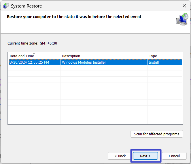 2. Seleziona il punto di ripristino creato prima che iniziasse a comparire l'errore e fai clic su "Prossimo“.