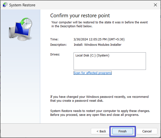 3. Quindi, fare clic su "Fine" per ripristinare il sistema.