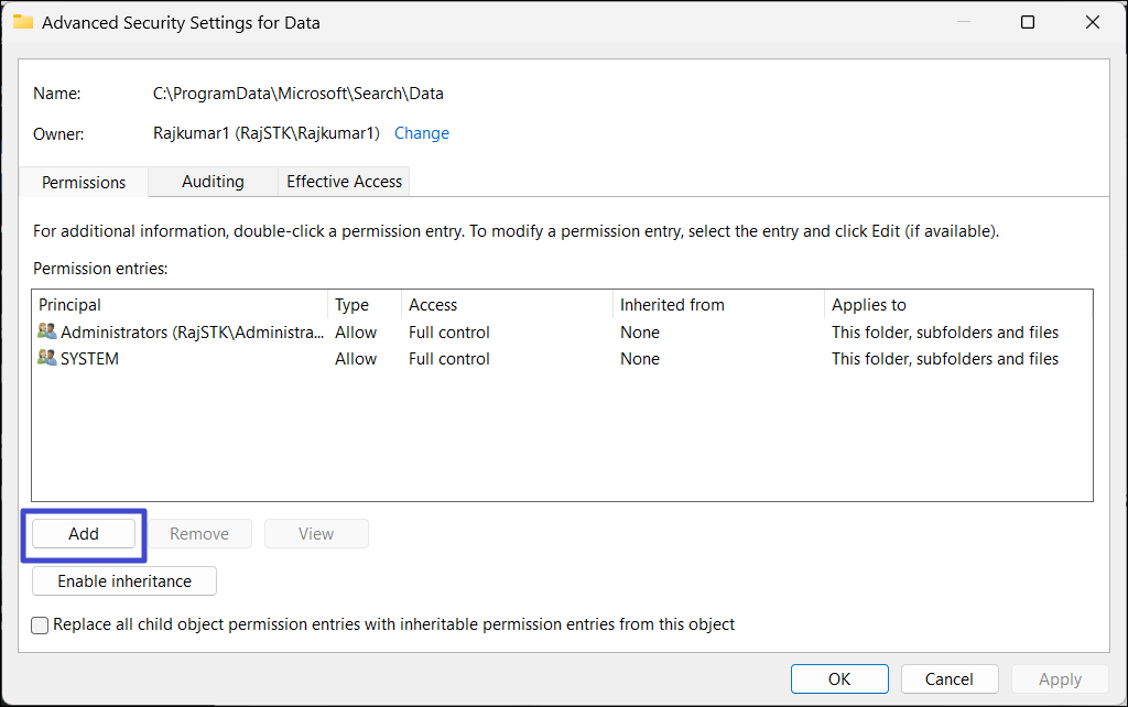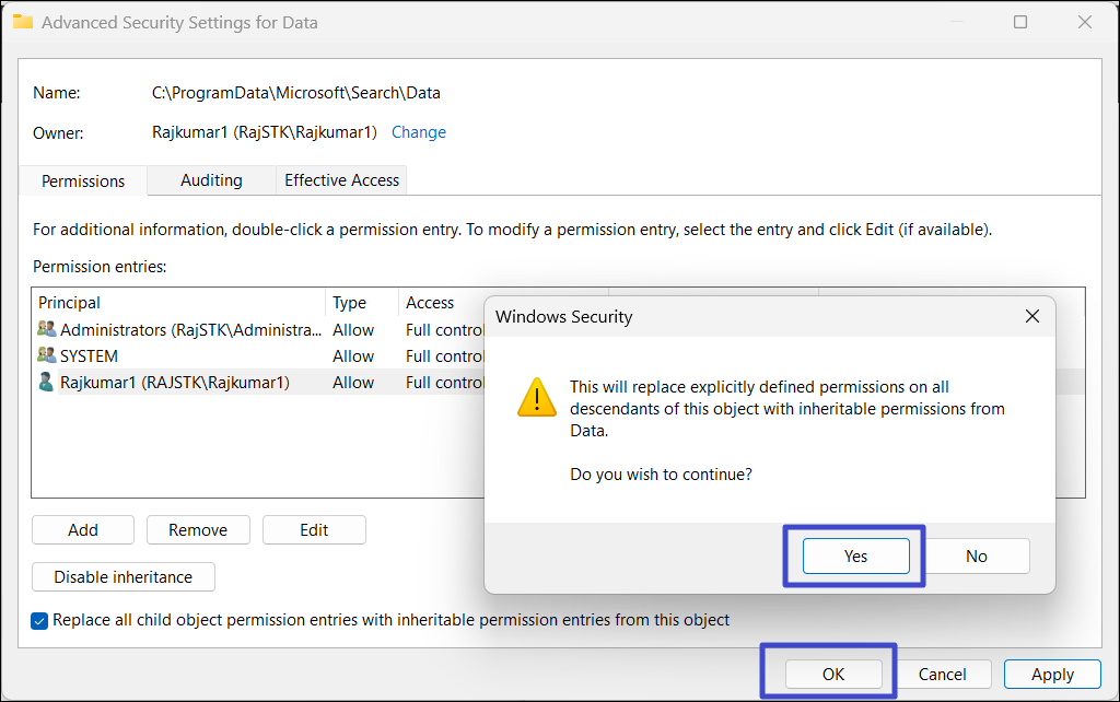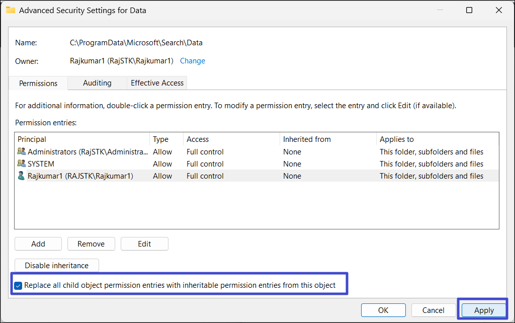 10. Successivamente, controlla "Sostituisci tutte le voci di autorizzazione dell'oggetto figlio con voci di autorizzazione ereditabili da questo oggettoopzione.
