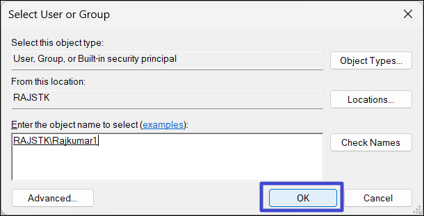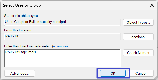 5. Successivamente, fai clic su "Avanzato"nella casella Seleziona utente o gruppo.