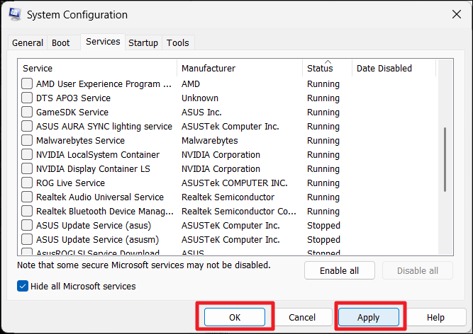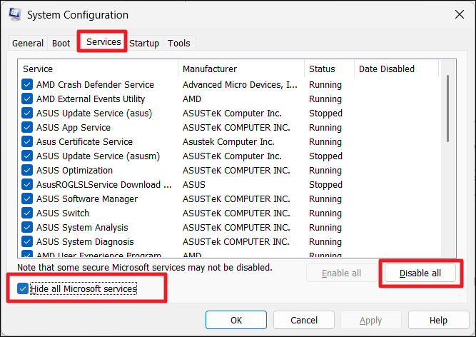 2. Vai su “Servizischeda ", seleziona"Nascondi tutti i servizi Microsoft", e fare clic su"Disabilita tutto“.