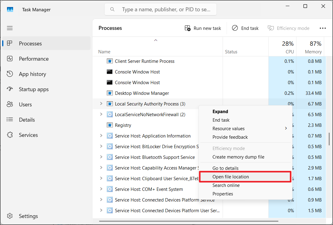 2. Nella sezione Processi di Windows, fare clic con il pulsante destro del mouse su "Processo dell'Autorità di Sicurezza Locale”O "Servizio del sottosistema dell'autorità di sicurezza locale"processa e seleziona"Apri il percorso del file“.