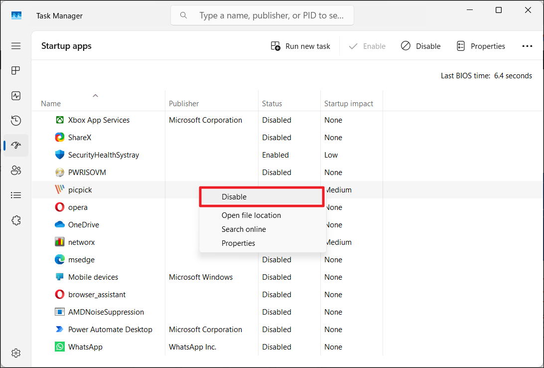 4. Fare clic con il pulsante destro del mouse su ciascun elemento di avvio e fare clic su "Disabilita“.