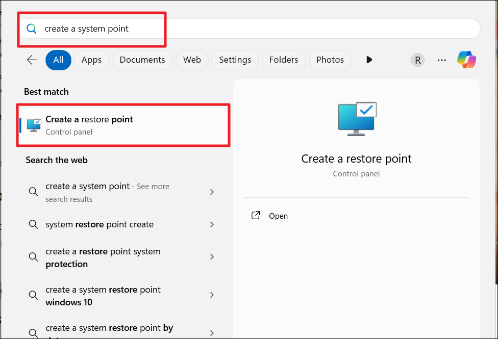 1. Cerca "creare un punto di ripristino"e premi Invio.