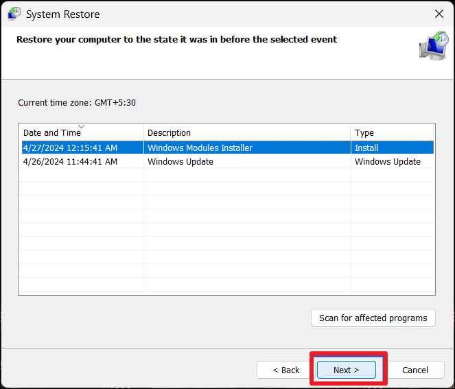 3. Scegli un punto di ripristino e fai clic su "Prossimo“.