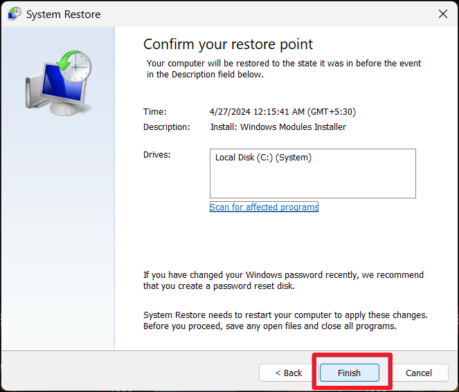 4. Dopo aver confermato il punto di ripristino, fare clic su "Fine“.