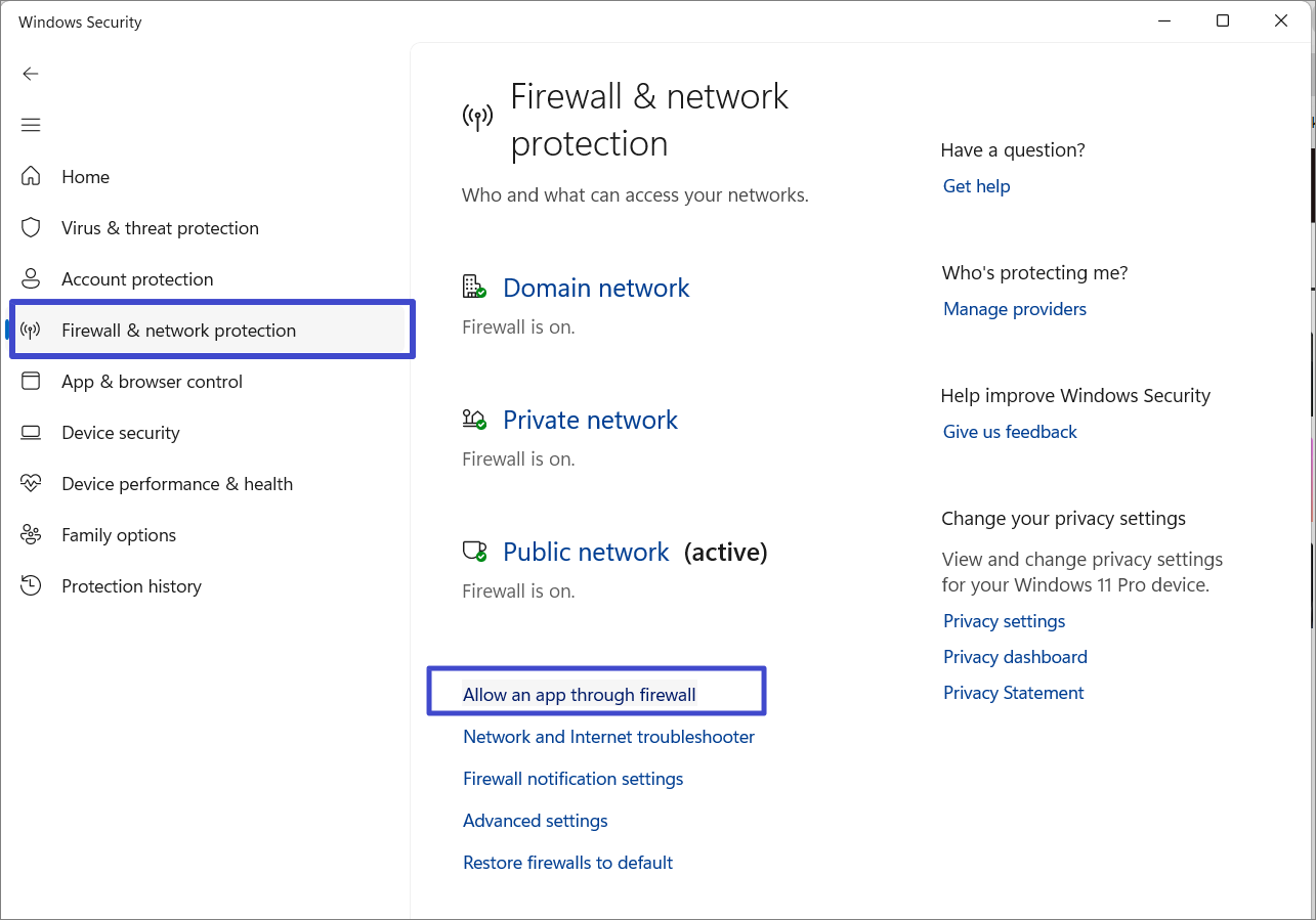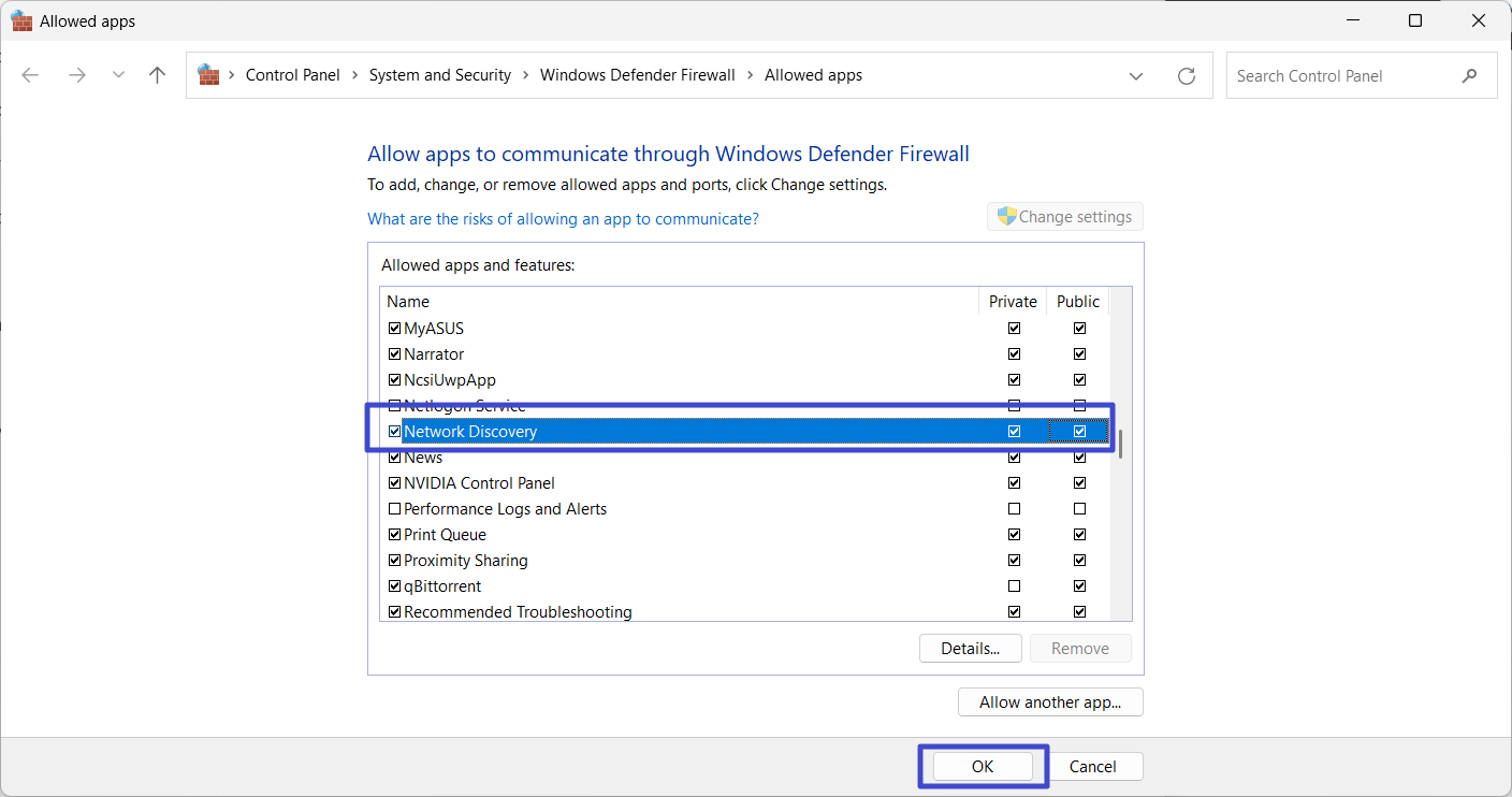 3. Trova “Scoperta della rete”SottoApp e funzionalità consentitee controlla se entrambiPubblicoEPrivatole caselle sono selezionate accanto ad essa.