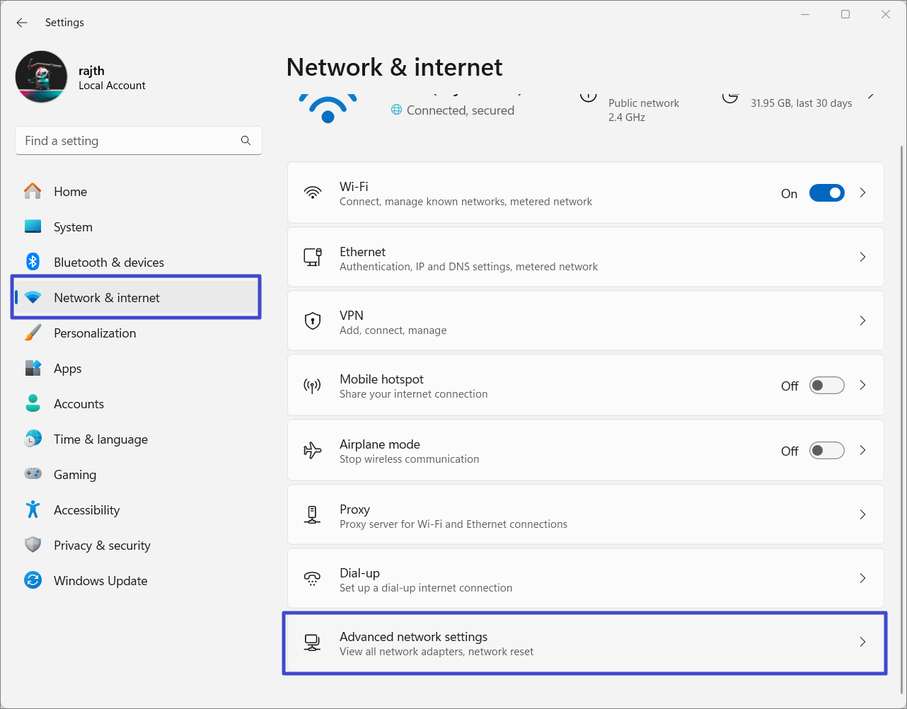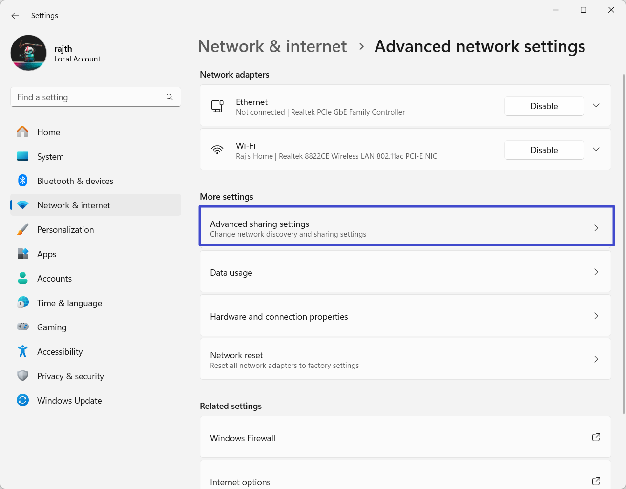 1. Apri Impostazioni di Windows e vai su "Rete e Internet” > “Impostazioni di rete avanzate”.