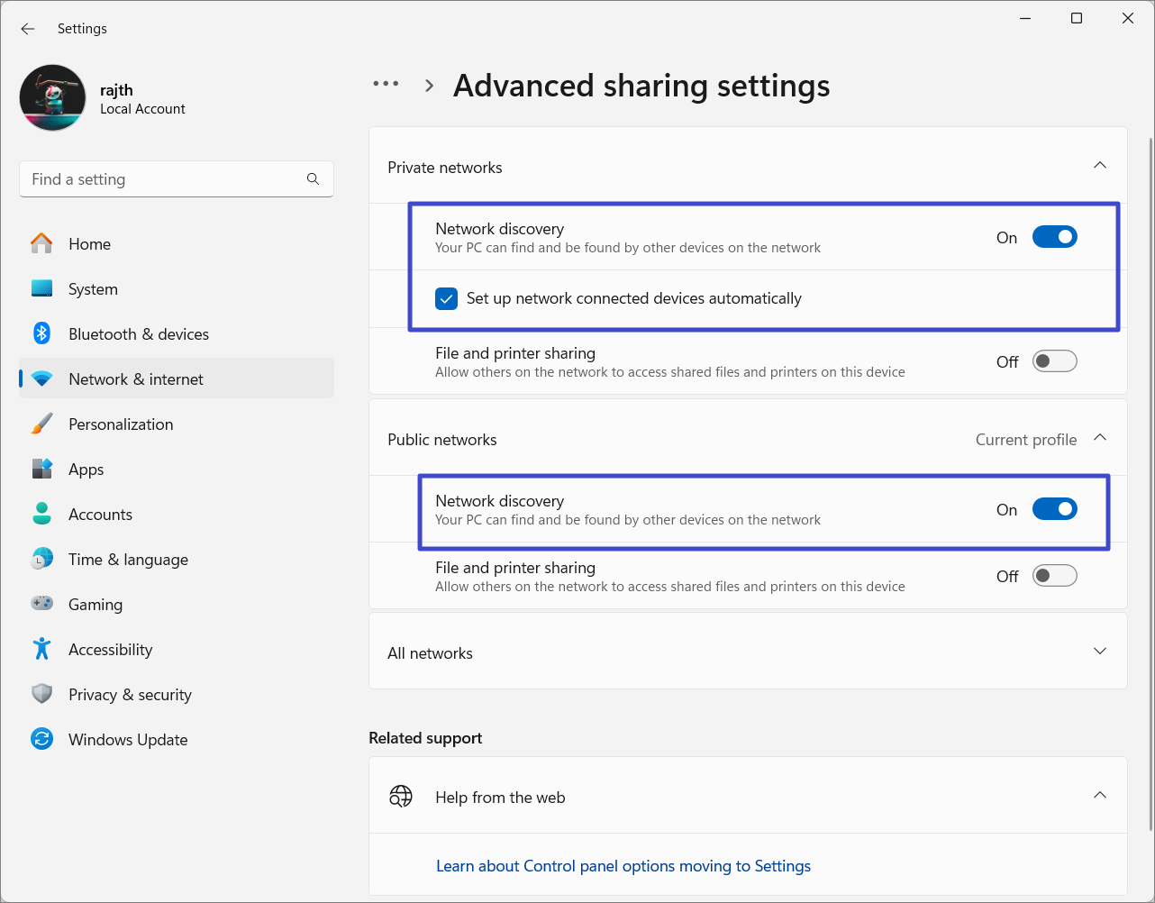 4. Assicurati che "Scoperta della rete”l'interruttore è attivato e seleziona "Configura automaticamente i dispositivi connessi alla reteopzione.