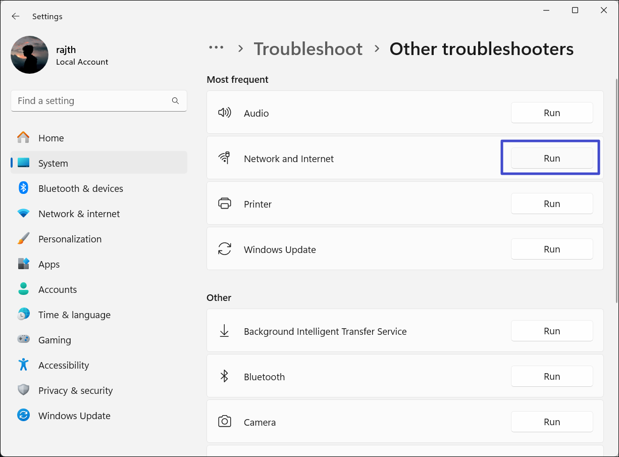 3. Fare clic su "Correre"accanto aRete e Internet.