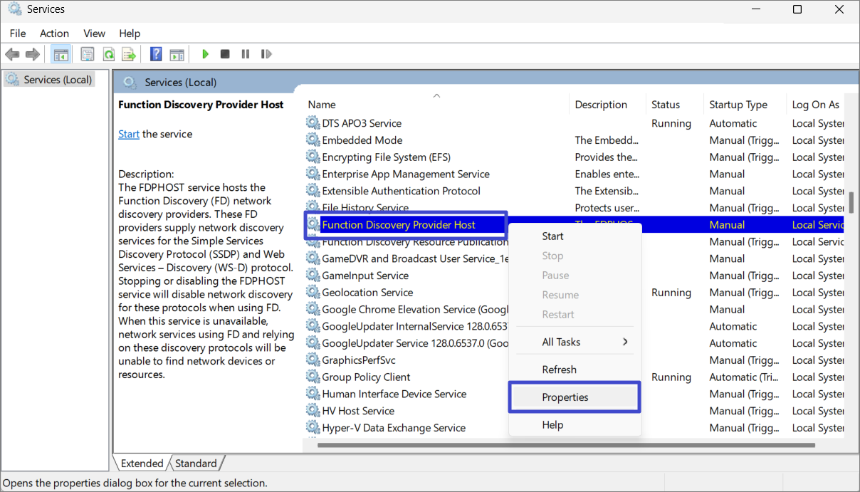 1. Una volta trovato un servizio, fai clic destro su di esso e seleziona "Proprietà“.