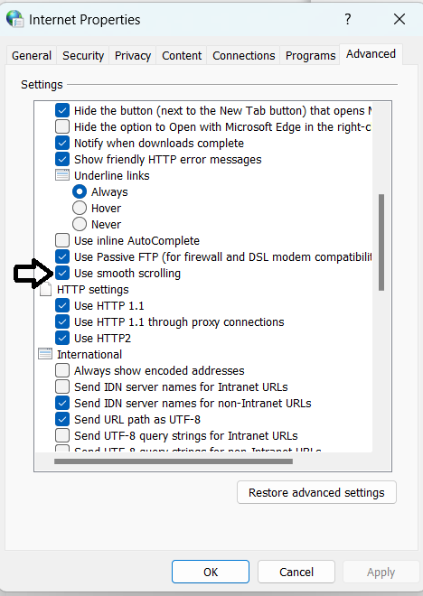 3. Nella sezione del browser, deseleziona l'opzione “usa scorrimento fluido”.