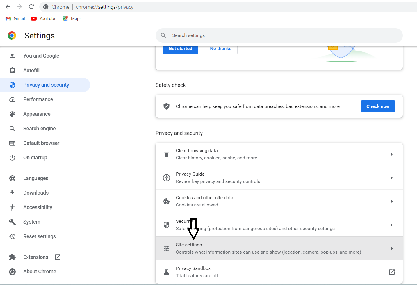 5. Seleziona "impostazioni sito" sul lato destro.