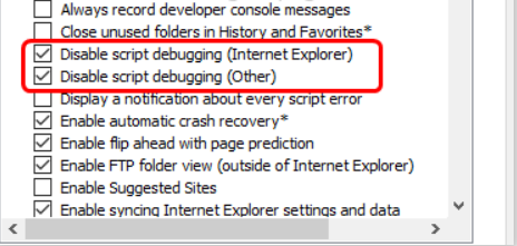 4. Nella sezione di navigazione spuntare le caselle “disabilita debugging degli script (Internet Explorer)” e “disabilita debugging degli script (altro)”.