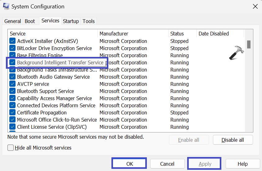 2. Sotto ilServizischeda, deseleziona la casella "Servizio di trasferimento intelligente in background" scatola.
