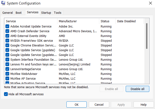 - Spunta la casella suggerimentoNascondi tutti i servizi Microsofte fare clic suDisabilita tutto.