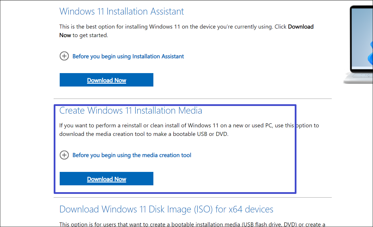 1. Vai al sito Web ufficiale di Microsoft e scarica lo strumento Crea supporto di installazione di Windows per Windows 11 o Windows 10 in base alle tue esigenze.