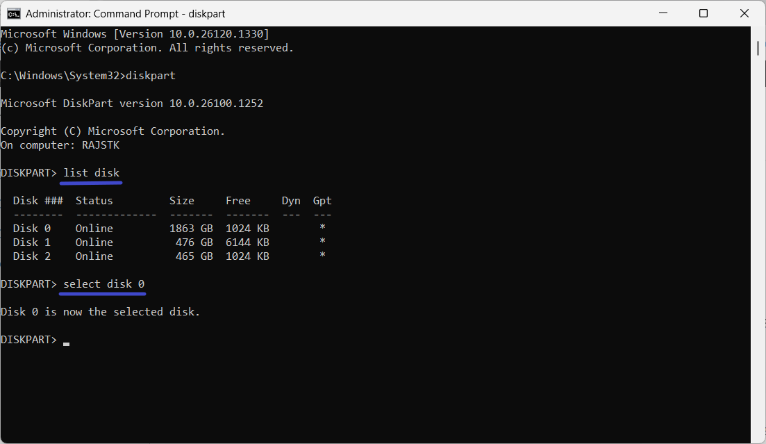 #nella colonna GPT c'è un disco GPT. Se non c'è l'asterisco, è un disco MBR.4. Quindi, esegui "seleziona il disco #”comando per selezionare l'unità principale. Assicurati di sostituire