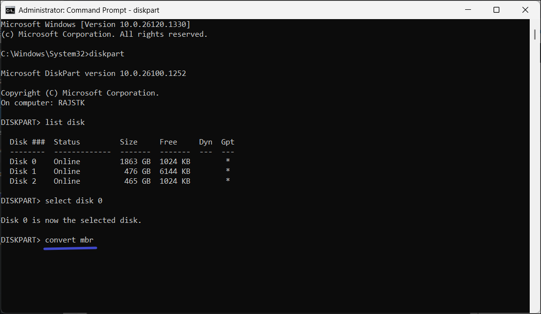 con il numero del disco che desideri convertire. Questo comando controllerà rapidamente se il tuo disco è compatibile con la conversione. In caso di problemi, verrà visualizzato un messaggio di errore.