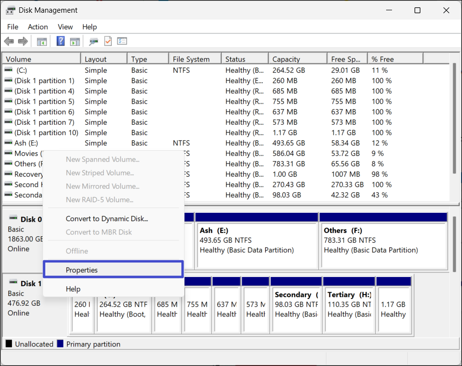 i.e. Disk 1“.2. Fare clic con il pulsante destro del mouse sul disco su cui è installato Windows e selezionare "Proprietà". Inoltre, prendere nota del numero del disco