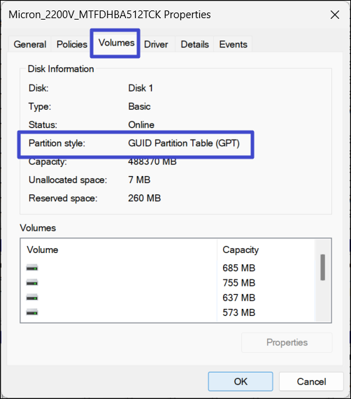 Volumi.3. Controlla il "Stile di partizione"sotto il"