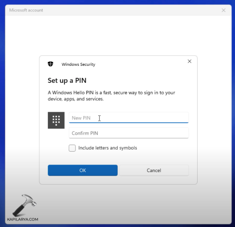 5.Successivamente, riceverai un nuovo popup di Sicurezza di WindowsImposta un PINintestazione. Digita il tuo nuovo PIN e confermalo. ClicOK.