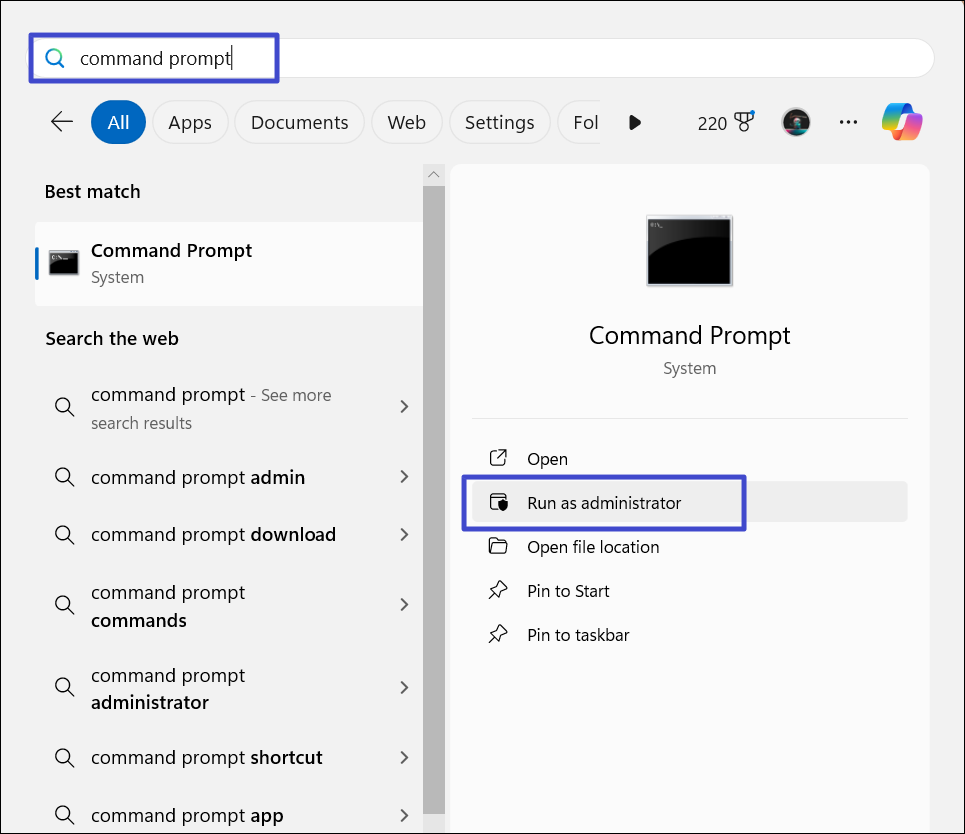 1. Premere il tasto Windows, digitare "Prompt dei comandi”,e seleziona "Esegui come amministratore“.