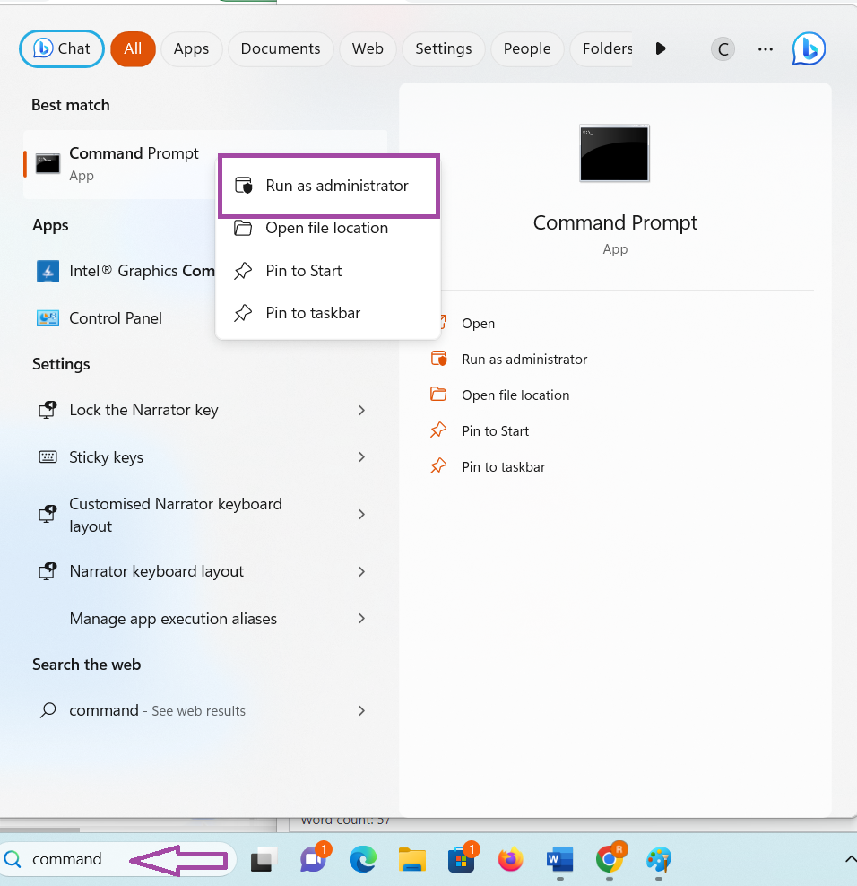 1. CercaPrompt dei comandinella barra di ricerca. Quindi fare clic con il tasto destro e selezionareEsegui come amministratore.